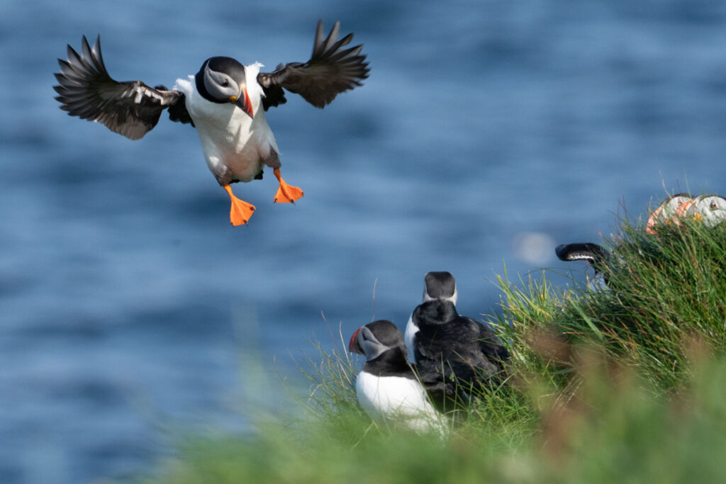 Because of their solid, slightly rotund body (well suited to diving), the puffins must work hard to stay airborne. Once they're up in the air, their wings can flap up to an astonishing 400 times per minute! When the birds come in to nest during the spring and summer, they favour rocky outcroppings, using grass and feathers to build their home.