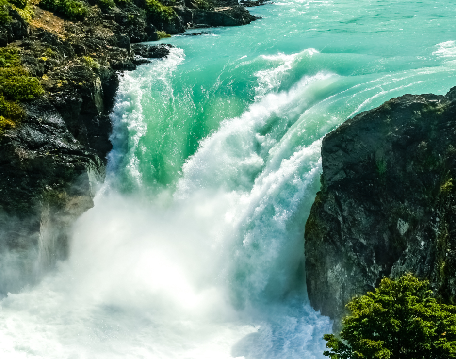 Stemming from the Nordenskjöld Lake, the Salto Grande Falls gush through a narrow funnel in a thundering churn of water that emerges into Lago Pehoe.