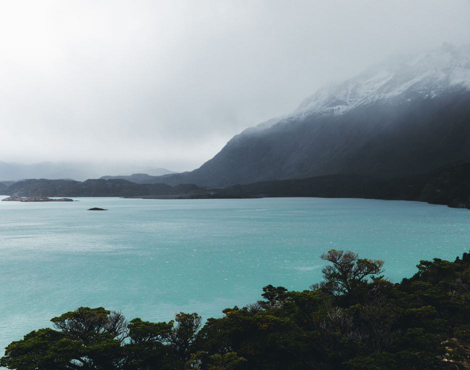 The crystalline Pehoe Lake in the Magellanes region provides a breathtaking mirror reflection of the mountain range, with its characteristic powder-blue water a striking contrast to the surrounding scenery.